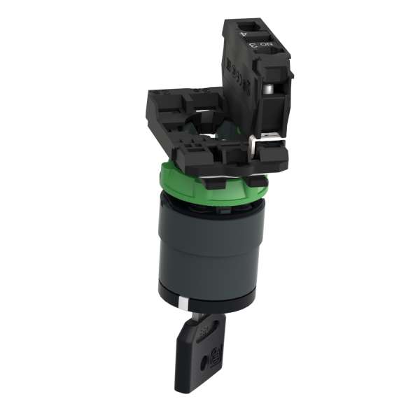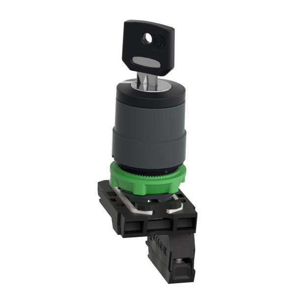Key switch selector, plastic, black, Ø22, key n°455, 2 positions, stay put, 1 NO